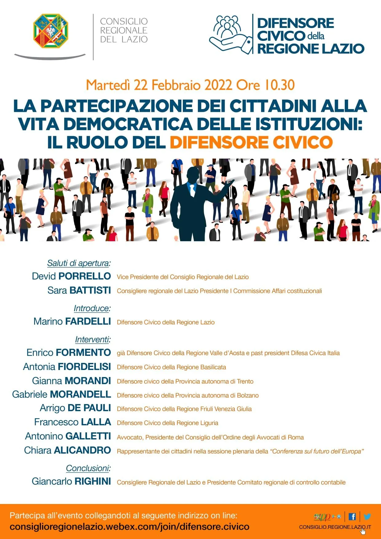 Si è svolto il giorno martedì 22 febbraio 2022 il webinar riguardante "LA PARTECIPAZIONE DEI CITTADINI ALLA VITA DEMOCRATICA DELLE ISTITUZIONI: IL RUOLO DEL DIFENSORE CIVICO" su iniziativa del Difensore civico della Regione Lazio dott. Marino Fardelli.