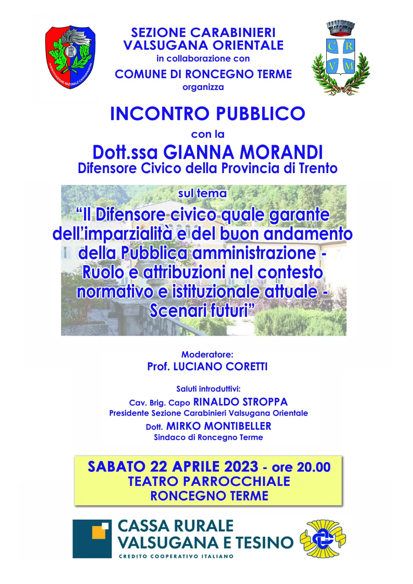 Si è svolto a Roncegno Terme in data 22 aprile 2023 ad ore 20.00 un incontro sul seguente tema: "Il Difensore civico quale garante dell'imparzialità e del buon andamento della Pubblica amministrazione - Ruolo e attribuzioni nel contesto normativo e istituzionale attuale - Scenari futuri".