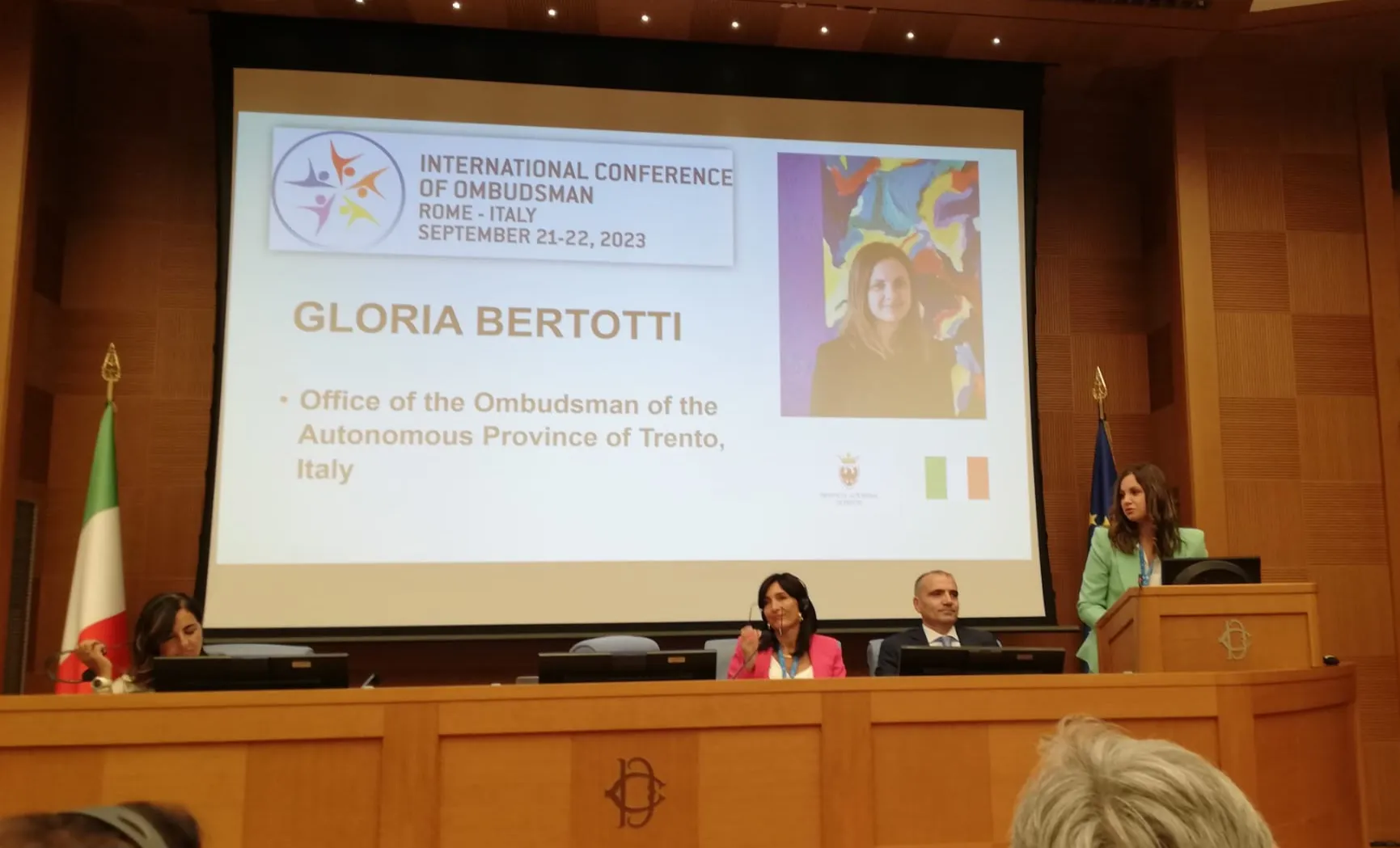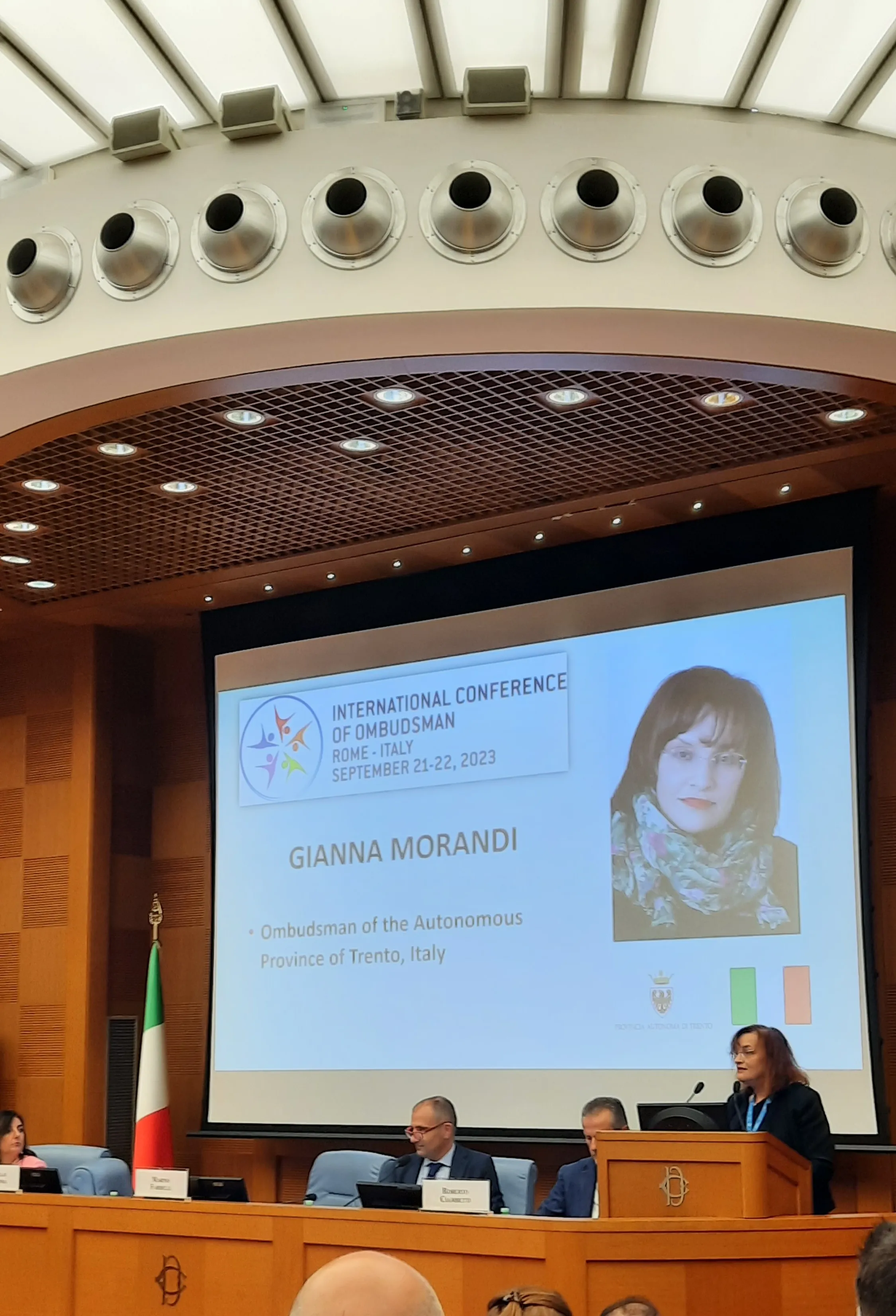Nelle giornate del 21 e 22 settembre si è svolta a Roma, presso la Sala dei gruppi parlamentari della Camera dei Deputati la conferenza internazionale degli Ombudsman dal titolo “Il ruolo dell'Ombudsman nel mondo: tra realtà e possibilità”, organizzata dal Difensore civico della Regione Lazio, dott. Marino Fardelli, tra l'altro Presidente del Coordinamento nazionale dei Difensori civici regionali e delle Province autonome. L'obiettivo principale della conferenza era promuovere la collaborazione internazionale e lo scambio di buone pratiche tra Difensori civici di tutto il mondo, al fine di tutelare i diritti dei cittadini e garantire una governance trasparente ed equa. La finalità dell'iniziativa è da correlare alla creazione di un forum unico in cui i Difensori civici potessero condividere le loro esperienze e discutere le sfide comuni che affrontano nel loro lavoro quotidiano, legate alla tutela dei diritti umani, alla partecipazione democratica e alla giustizia sociale. Alla conferenza hanno aderito i rappresentanti della difesa civica di 55 Paesi di tutto il mondo. Nella due giornate hanno preso parola, in qualità di relatrici, anche il Difensore civico di Trento Gianna Morandi e la dott.ssa Gloria Bertotti, funzionario della struttura, trattando, rispettivamente, i temi della costituzione di parte civile del Difensore civico nei procedimenti penali che abbiano come vittime persone con disabilità e della trasformazione digitale nella Pubblica Amministrazione e del digital divide.